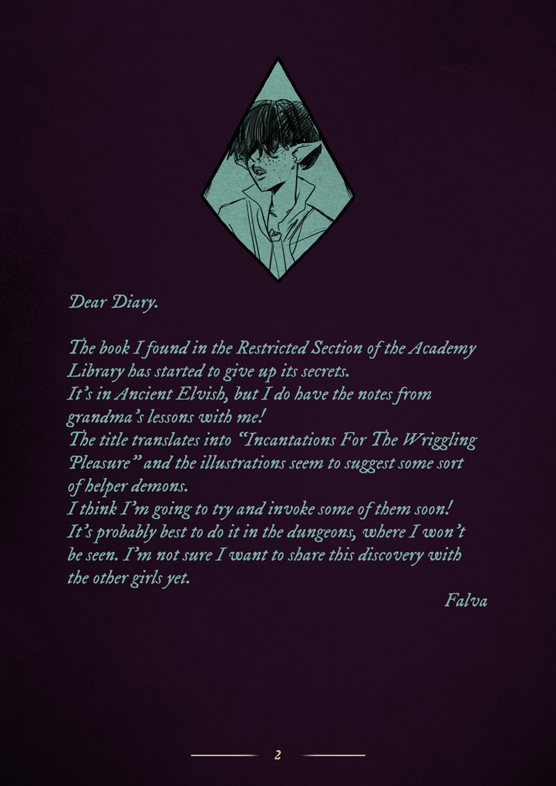 A story-artbook with a collection of tentacle-themed, adult illustrations set in a magical college and connected into a story by way of letters and diary entries.